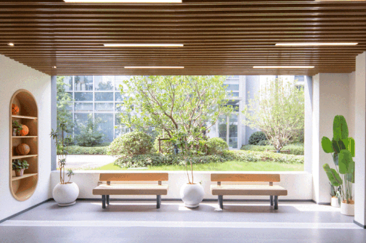 放眼整个板块,海棠喜舍的建筑立面一定最先抓住视线——没有繁复的装饰堆砌,利落的直线条再加上浅香槟色搭配大面积的玻璃幕墙,把「雅致」二字写进建筑的骨相里。