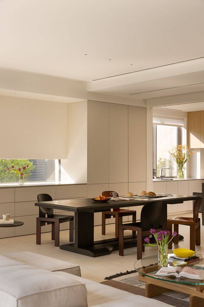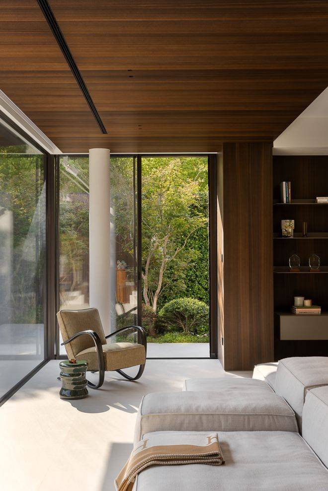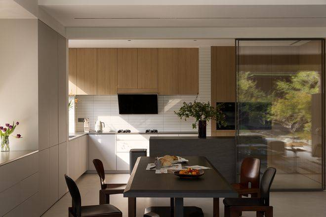 玄关作为“起”的一个过渡空间。一侧的采光天井让光影和绿色形成一幅活的框景,让人一入门便卸下尘世喧嚣。玄关的转折后便进入了豁然开朗的公共区域,客厅、餐厅、厨房一体化的设计。这里承载了家庭生活的核心,朝南近10米宽的大落地玻璃窗,让整个花园的景色映入眼帘。