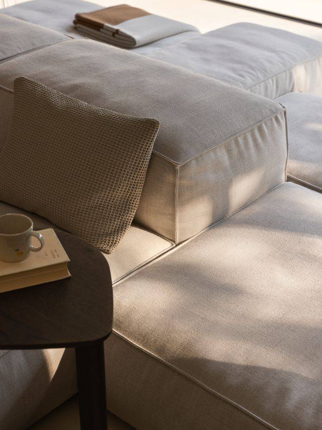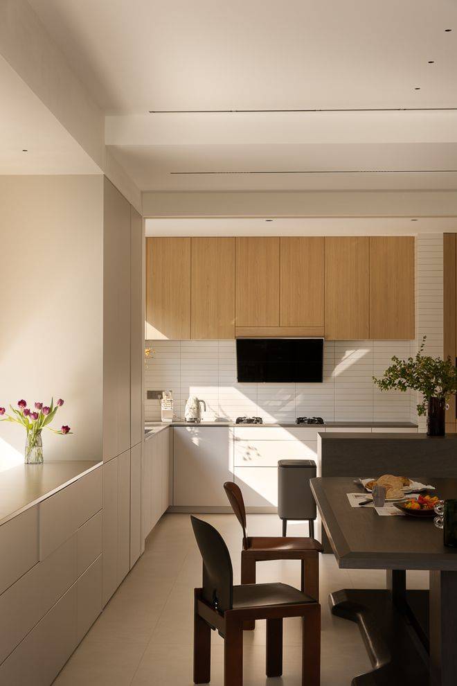 整体室内采用了大地色系为基调,如米白、浅灰、橡木色。局部点缀深色木色,营造沉稳、温暖的氛围。材质也是橡木地板,艺术涂料,天然石材台面相互搭配。强调材质的天然肌理与触感,传递出温润、质朴的美学感受。