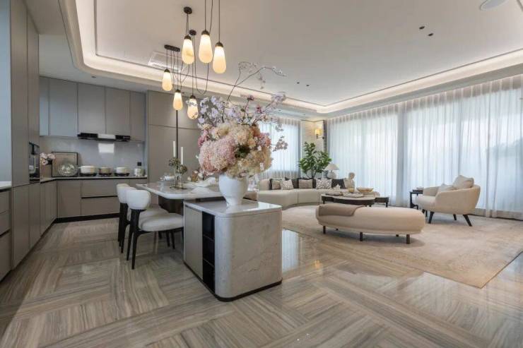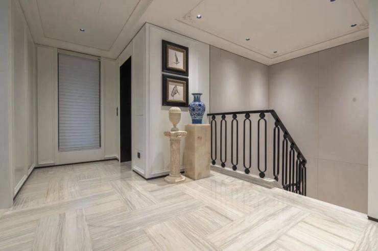 细节部分如客餐厅地面采用希腊木纹大理石,所有卧室斜向鱼骨拼接拼花地板,楼梯是玻璃扶手,弧形转角吊顶……整体看下来,项目的精装修还是蛮扎实的。