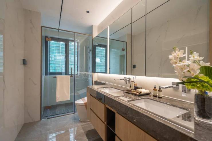 建面约146㎡做到了5开间朝南,大面宽短进深,南向阳台+飘窗面宽达约16.6m,可以做到双厅三房朝南,叠加浴缸、双台盆、休憩区等套房式主卧,这可是200㎡大平层才能达到的尺度。