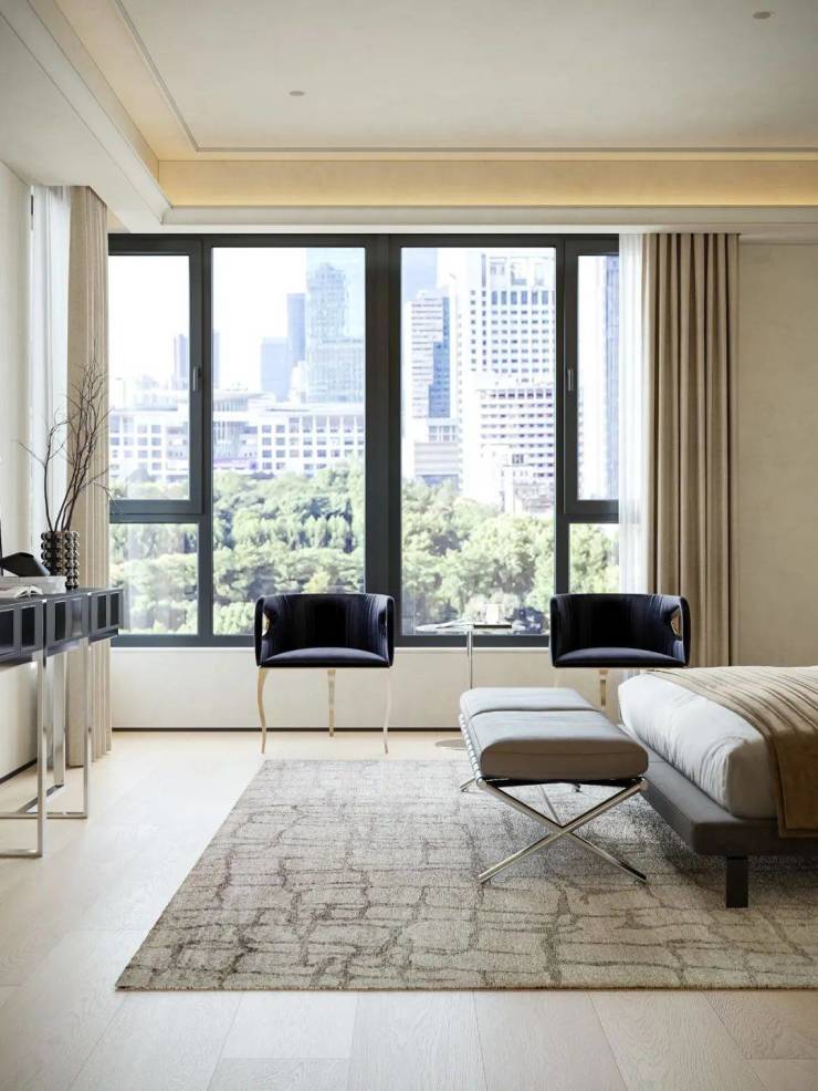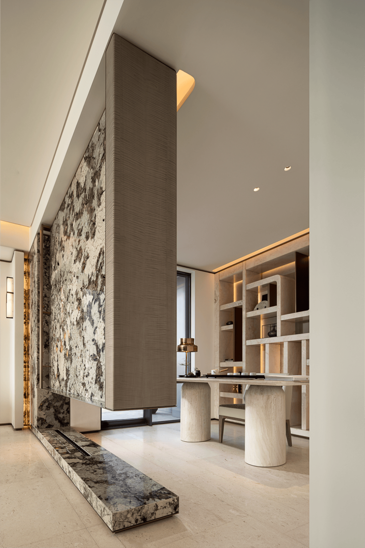 主卧采用留白设计,保留部分家具,摒弃繁复装饰与色彩堆砌,以形体美、轻重色和谐及精准功能布局满足家庭需求。洞石纹板与原生木色搭配,低饱和色调奠定幽远宁静基调。简练线条与天然材质纹理交织,褪去冗余,在素净空间中营造出温润的时光质感。