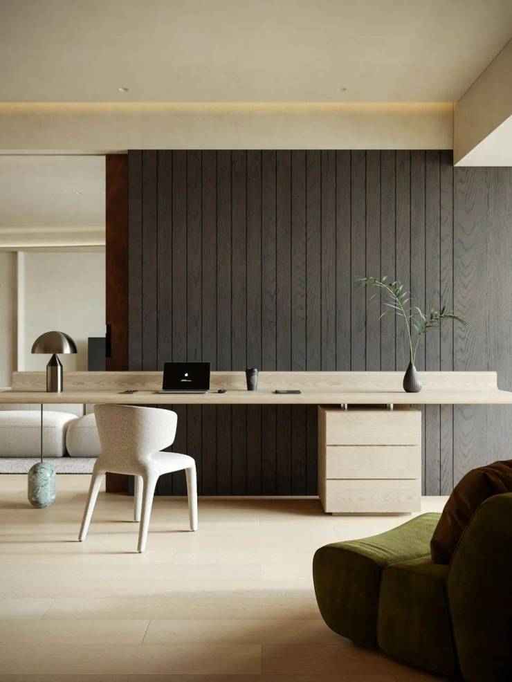 拆除卧室原有隔墙,拓宽空间尺度,引光入室勾勒家的轮廓。口袋移门隐于饰面板隔墙内,赋予书房未来独立成卧的灵活可能。温润木质书桌搭配黑色木饰面,划分功能区的同时,增添空间层次感与韵律感。共享区与多功能书房相互呼应,实现 “各享其趣,抬眸可见” 的理想互动场景。