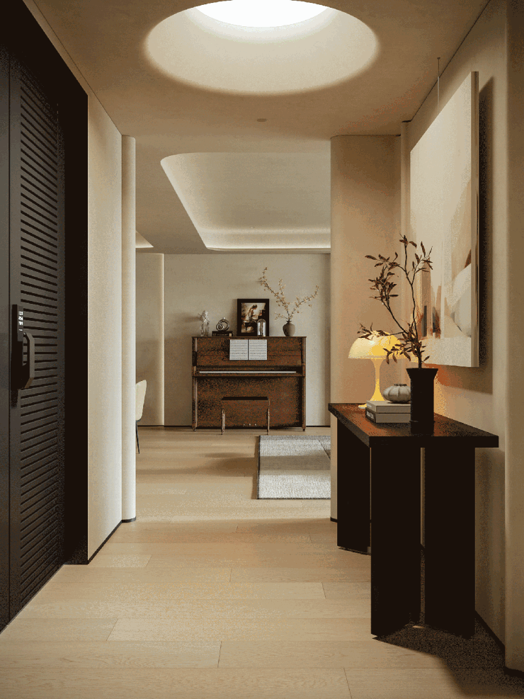 客餐厅以连贯视角奠定视觉基调,顶面弧线替代尖锐线条,贯穿空间削弱压迫感,延伸视觉开阔度。柔和暖色调交织出丰富层次,搭配弯曲线条勾勒轮廓,营造松弛宁静的生活氛围,弧线更成为串联空间的点睛之笔。