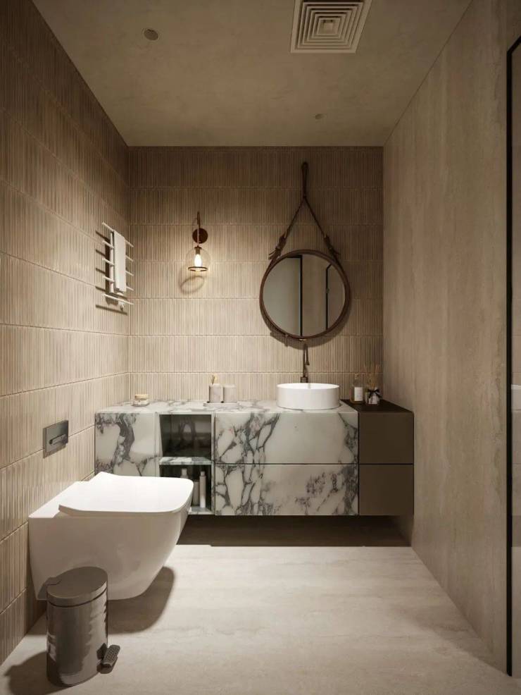 次卫通过墙体布局调整,拓展活动空间并提升收纳能力,延展洗手池增强使用便利性。在风格设计上,洞石砖与拇指砖搭配铺贴,洞石砖天然纹理彰显自然美感,同色系拇指砖打破单调,二者相辅相成,在有限空间内打造出兼具实用性与艺术感的卫浴空间。