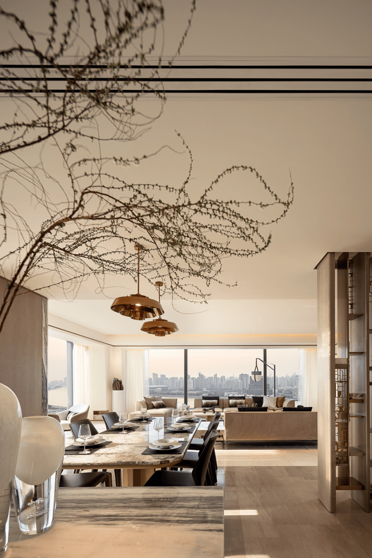 从玄关踏入共享区,拆除隔墙与阳台移门,拉开空间变革序幕。横向贯通阳台、客厅、餐厅、水吧四大区域,纵向以饰面隐藏门取代实体隔墙,同时打通客厅与半开放式多功能房,全方位打破空间壁垒。各区域相互渗透穿插,塑造出通透开阔、充满松弛感的公共空间,功能区的有机交融,充分满足多元使用场景需求。