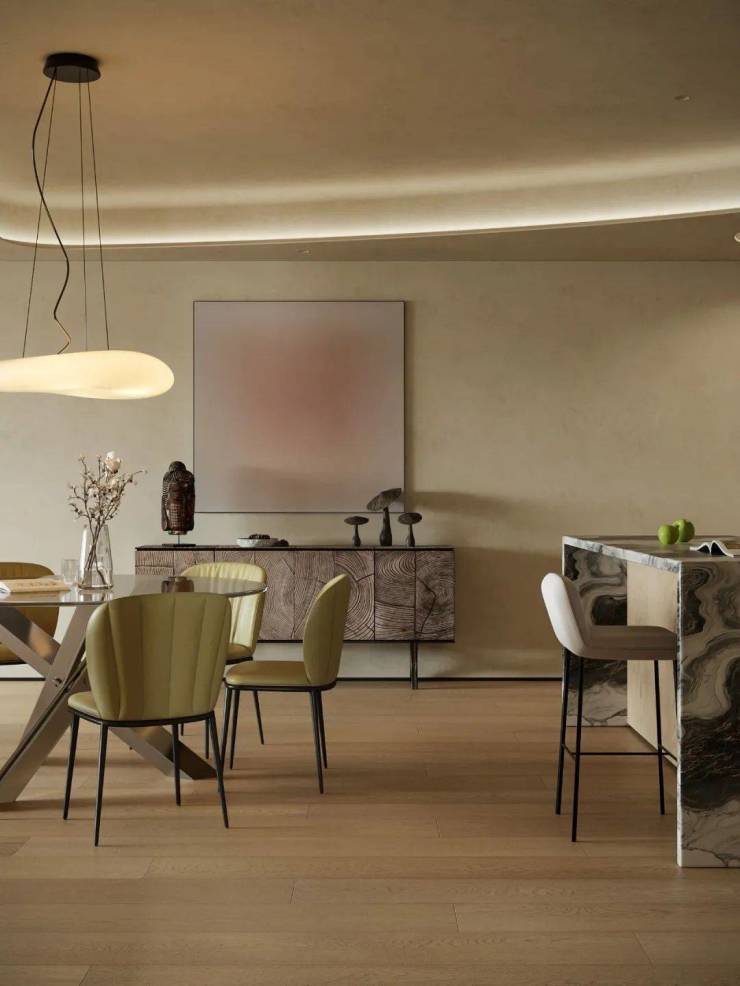 客餐厅连贯视角构建稳定视觉基调,梳理空间明暗层次。柔和温暖的主色调中,不同色彩交叠营造丰富层次,搭配弯曲线条勾勒空间轮廓,传递松弛宁静的生活氛围。
