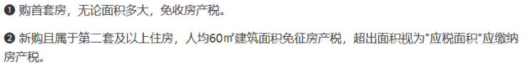 有本市长期居住证满3年可免交房产税(如只满1年先交2年到满3年可退前面2年交的房产税)。购买的第二套及以上住房在合并计算家庭全部住房面积后,给予人均60㎡的免税面积扣除。