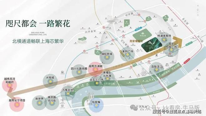 北横通道:继延安路高架后,上海第二条东西向财富积聚中轴线,平行于江河流向,串联虹桥-长风-苏河湾-北外滩-杨浦滨江等上海都心位置