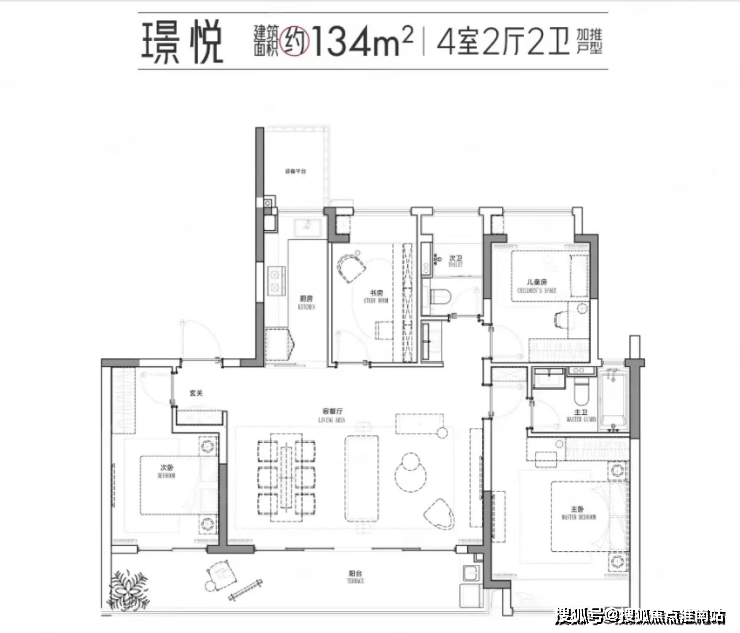 134㎡三房:总价约335-375万元,南向13.6m面宽,9.8m奢阔阳台