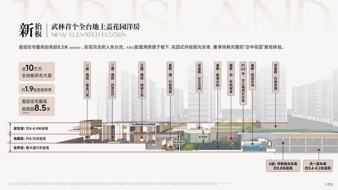 利用建筑新规创新设计,打造「板块首个全台地上盖花园洋房」。小区整体抬升约4.15米,巧妙规避“不利因素”,实现真正的人车分流。同时通过整体抬升的“上盖”设计,社区成为一个与地面喧嚣隔离的“空中绿洲”,实现了绝对的人车分流与纯粹的花园景观。即使是洋房,2楼也相当于传统楼盘的3-4楼高度,带来卓越采光、通风及观景视野。