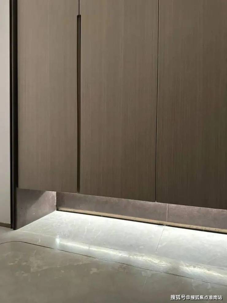 这个是入户玄关处的地面,大理石地面搭配金属线条勾勒出玄关地界,归家的氛围感从这个区域就开始了~这还不是重点,玄关座椅背后,是一面皮革包裹的墙面。鞋柜下方做了悬浮处理,同样也是内嵌灯带,这里灯光的角度还会再调整,因为灯光映射在大理石地面上,要显得尽量柔和不刺眼;同时,鞋柜下方可放拖鞋,还能放扫地机器人,便于日常清扫打理。鞋柜的饰面,纹路方向统一,呈现出极强的协调感。