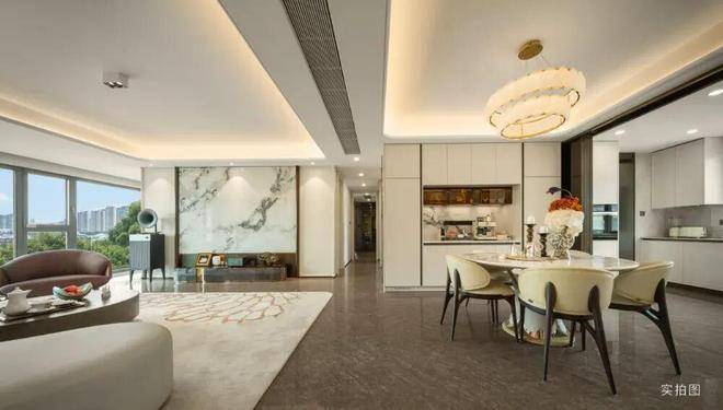 约43米奢贵门庭,百合花雕塑、200多片金色花瓣吊顶、莹莹生光的玉石大门,俯仰间皆瑰丽景致。挑空奢艺的归家大堂和地下光厅,天然石材铺贴,艺术审美延伸至归家每一步,