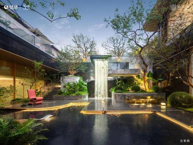 下沉庭院内,4颗丛生大乌桕围合,约5米高悬挑飞瀑灵动,搭配羽毛枫、镜面树池,营造度假酒店般的松弛与私密,归家仪式感与情绪价值拉满。