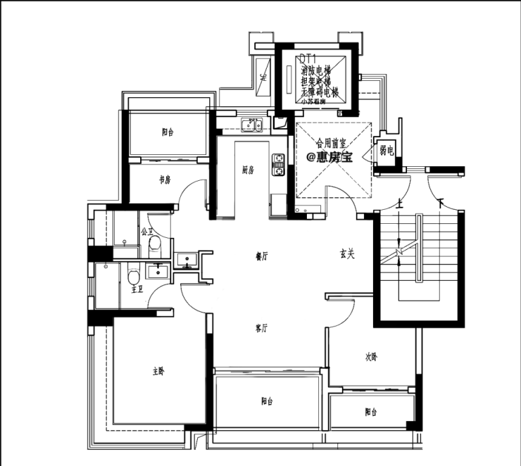 电梯门双开,类一梯一户,独立电梯厅;