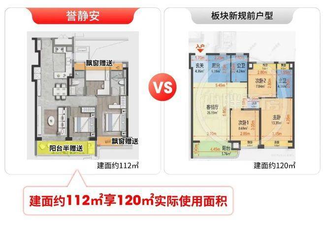项目最核心的优势,就是超高实得率。据小胖君测算:建面约112㎡户型,实际使用面积堪比新规前120㎡