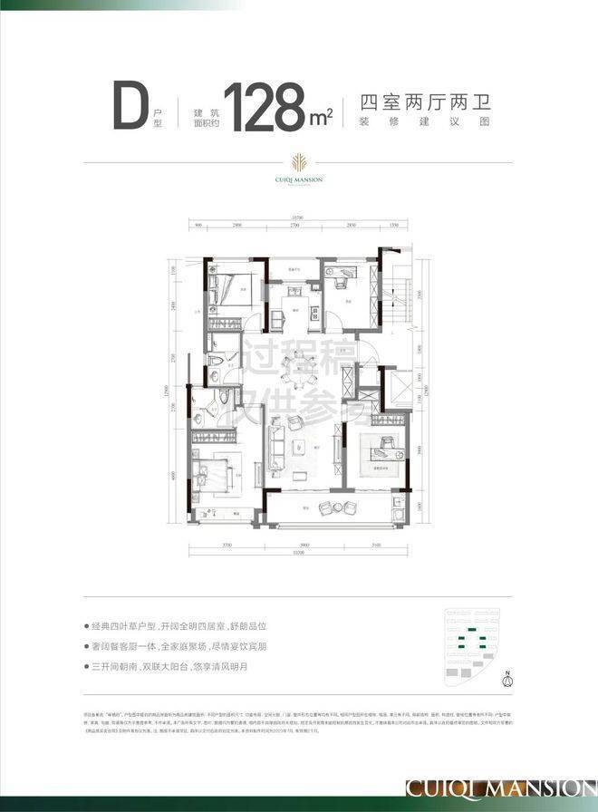 户型:主推建面约97-139㎡户型,其中97㎡为三房两卫三开间朝南,139㎡为四房两厅双阳台设计,餐客厅开间达6.7米,全屋精装交付(含地暖、中央空调、老板电器等)。