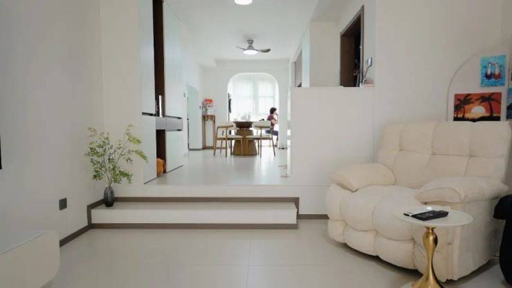2、客厅与餐厅之间以台阶连接:用最原始的“高差”手段,以零占地的垂直维度实现分区,保留90%以上的视觉通透性。