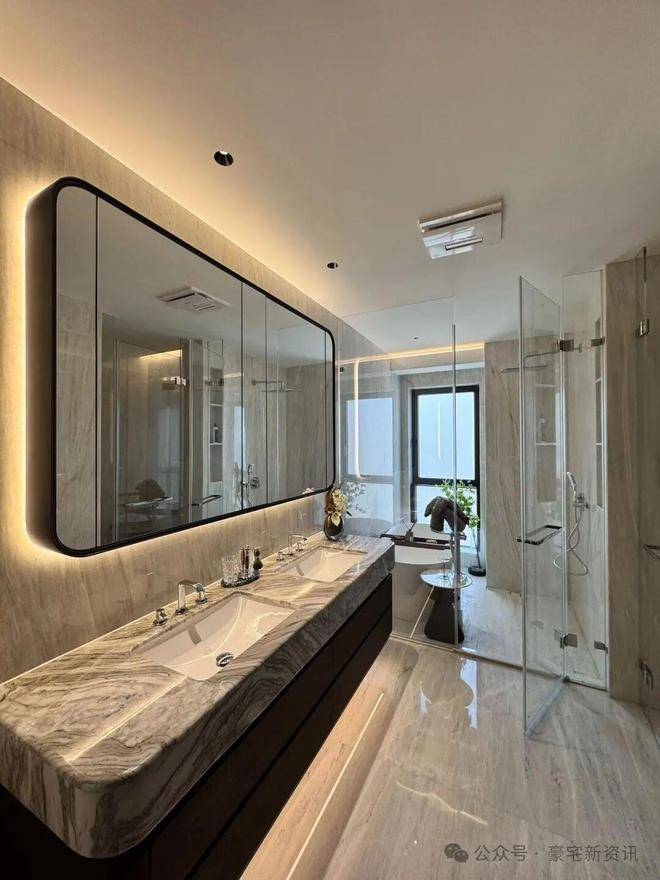 卫生间铺陈了大量静雅棕奢石,视觉效果一气呵成。