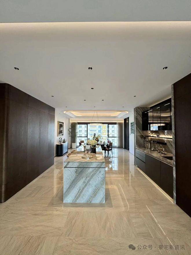 从私家电梯厅开始,地面局部点缀皇家蓝的玻利维亚蓝奢石,号称奢石中的爱马仕,并刻成海派花纹的样式,优雅又具仪式感。