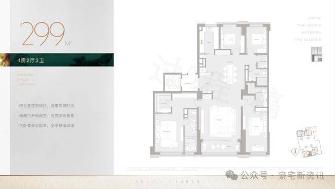 建面约299㎡,南向双套房,尤其主卧是豪华套房,带独立衣帽间,卫浴间含双台盆+淋浴+浴缸+马桶四件套。