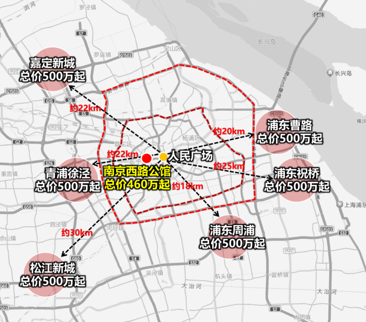 目前上海总价500万起的待入市新盘,大都集中在外环外、甚至郊环线外,板块距离市区距离较远,基本都在20km开外