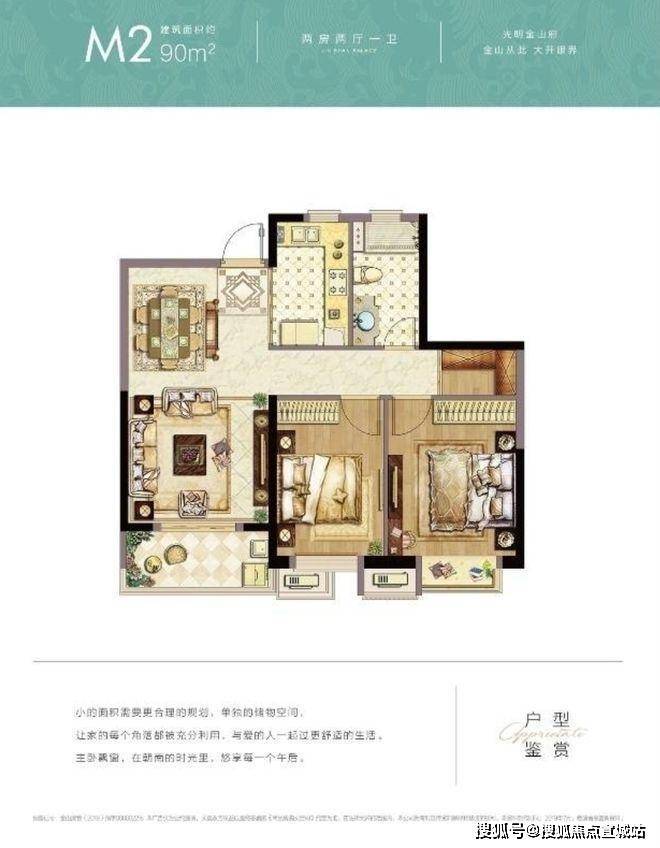 建面约90㎡2房2厅1卫,两间卧室朝南,舒适尺度搭配观景阳台,干湿分离的独立卫浴.