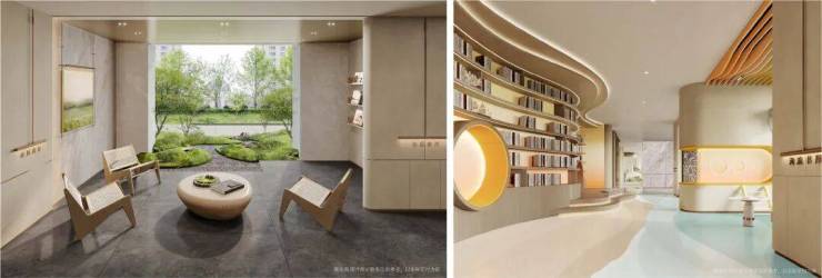 结合建筑、空间、自然环境关系,室内室外联动,呈现一个景观会客、海浪书屋、儿童休闲等多重功能的泛会所架空层,为全龄社交营造一个“有温度、有态度”的邻里空间。