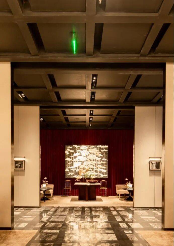 材料选用意大利石材,BVLGARI HOTEL大理石,铝型材塑型红,四层金属网格墙面以及梧桐叶金属屏风等,打造独属老静安的记忆符号,高奢定制,市区豪宅调性拿捏!
