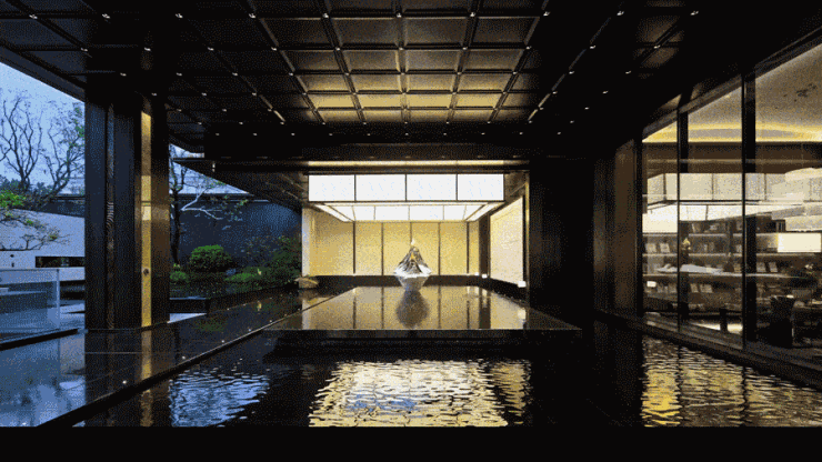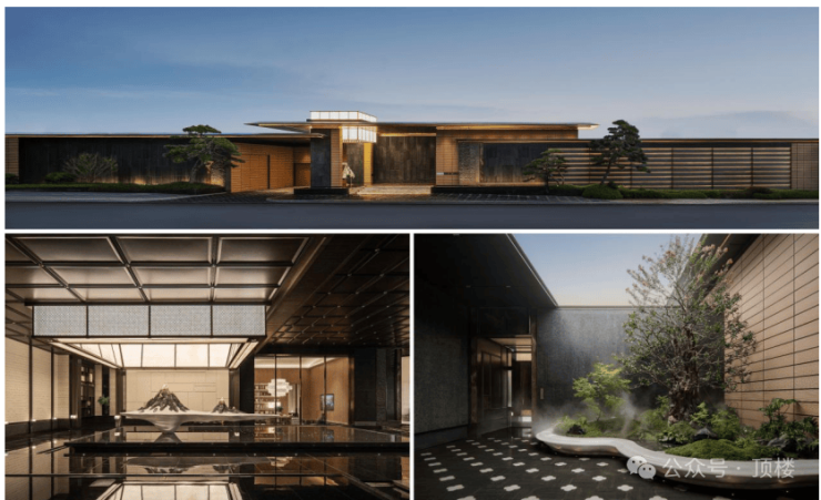 搭配安哥拉黑、范思哲黑景墙的独特工艺陶板,表面肌理皆为手工,门前排布的三棵迎客松,价值百万,彰显门第的华贵,而脚下则铺设“御窑金砖”,有着步步登高的寓意。