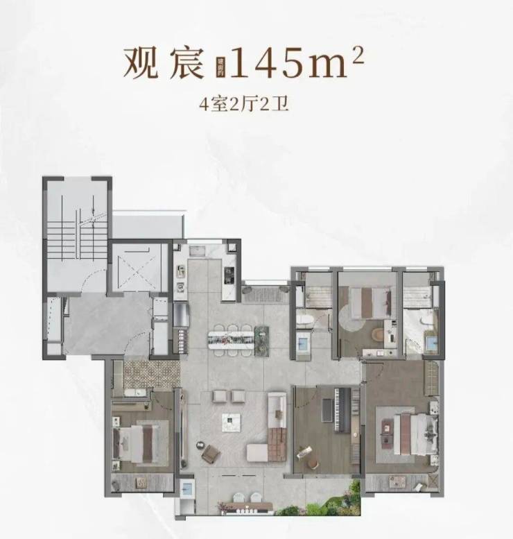 整个建面约145㎡4房2厅2卫的户型布局做到了大客厅、大开间、大卧室和大厨房空间。约145㎡户型,更是拥有南向四开间+面宽约14.5米。