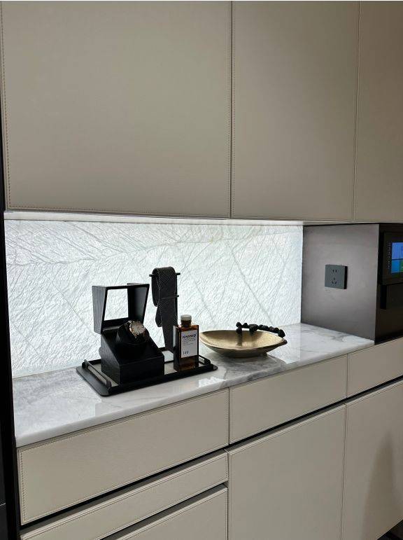入户玄关处的开放格背板采用罕见的白冰玉石材利用人造光源,通过石材的反射和折射,纹理清晰分明;