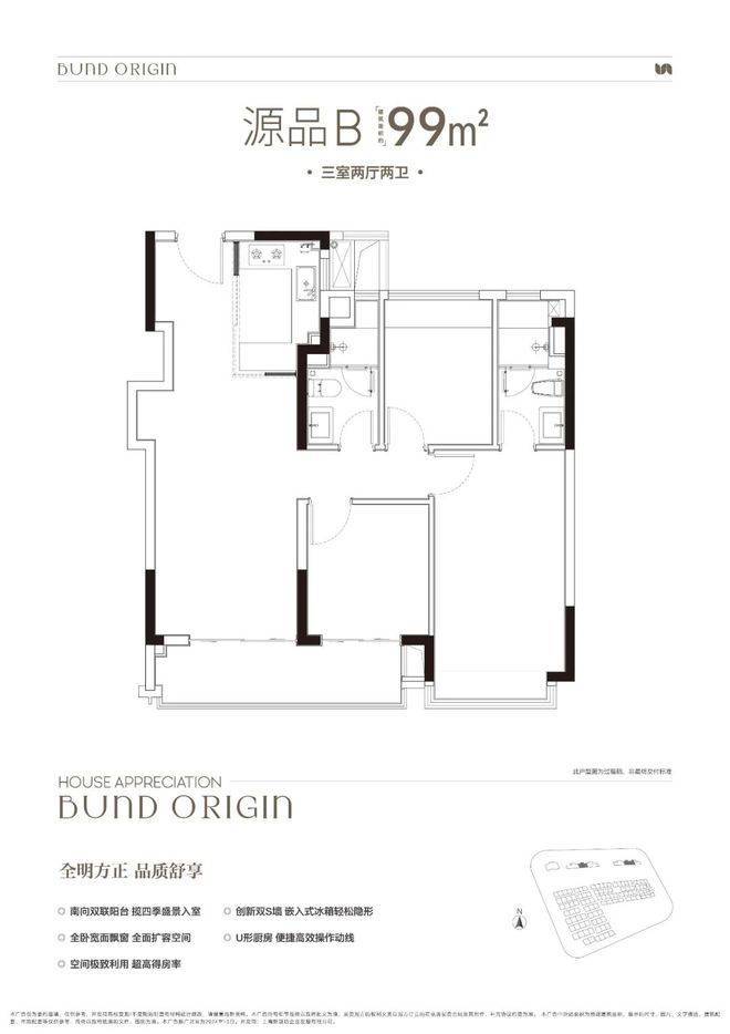 建面约99㎡3房2厅2卫,非常标准的动静分离、三开间朝南户型。
