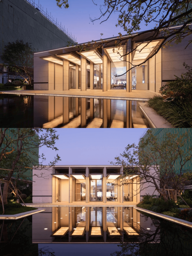 建筑立面选用米白与暖灰的现代轻奢色系,铝板线条+涂料一体板组合使用,简约线条设计,彰显现代典雅美学风格。