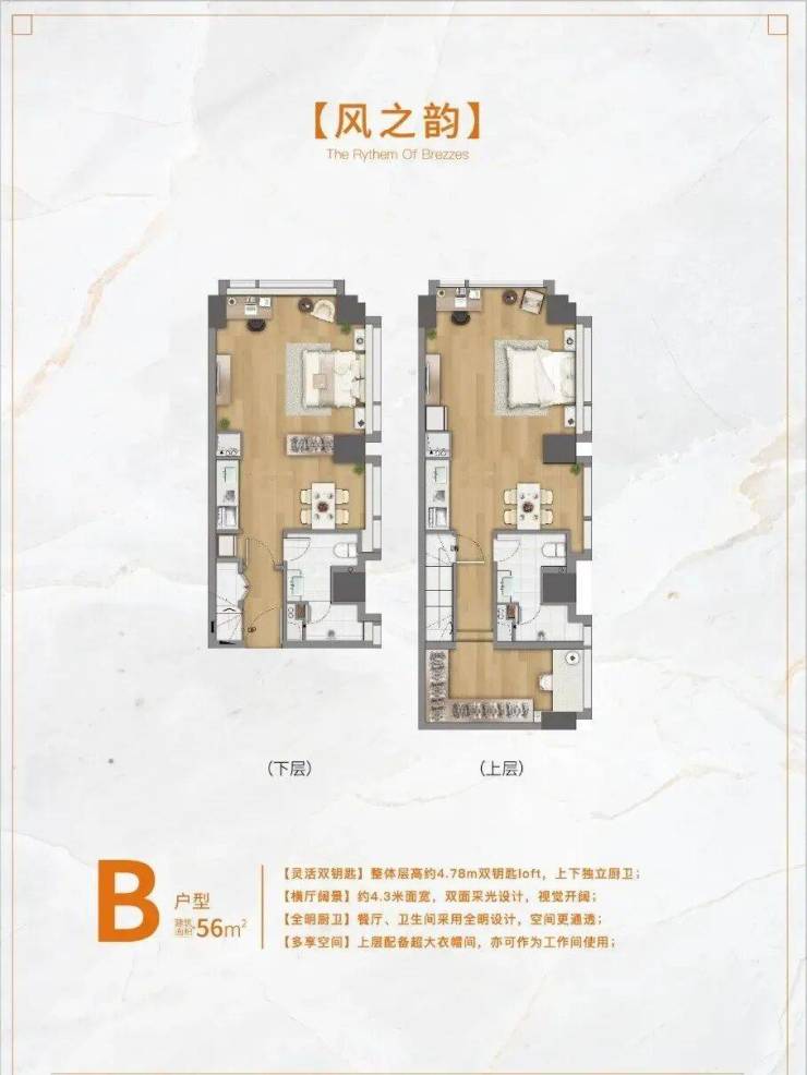 韵动城LOFT建筑面积约50-56㎡,复式双层设计,层高约4.78米,畅享自在高处生活。总价110万起!