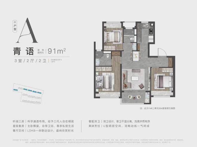 91㎡户型采用LDKB一体化布局,128㎡含南向双联阳台