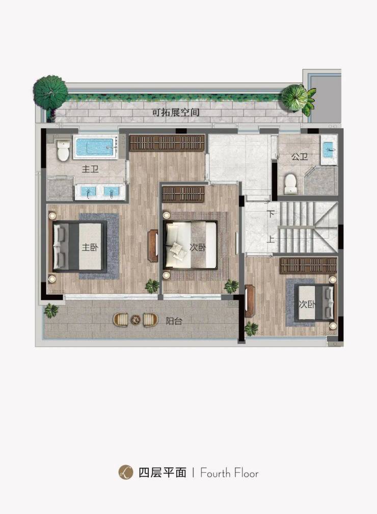 下叠带私享院子,下叠的一楼客餐厅直通约50-60㎡南向庭院,部分可达约100㎡花园,尺度豪华的主卧空间搭配足有7.2米长的连廊阳台,形成“主卧—书房—连廊阳台”的格局,即使起居在二层,也能与自然形成良好的互动。