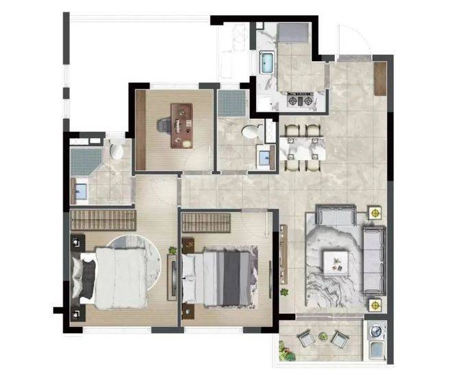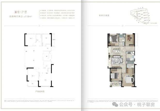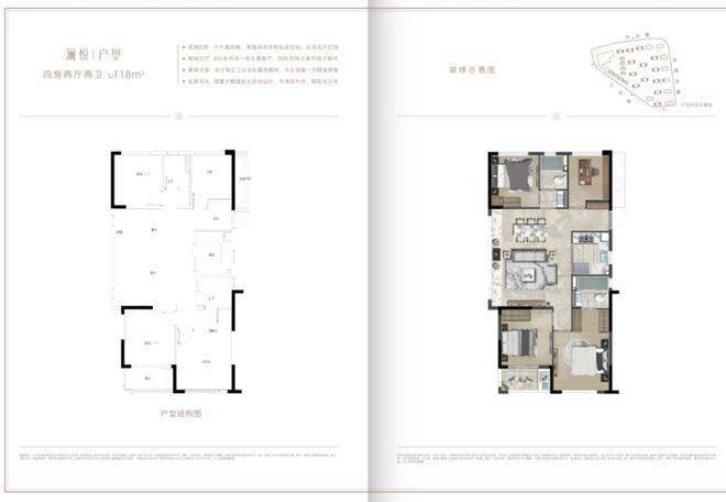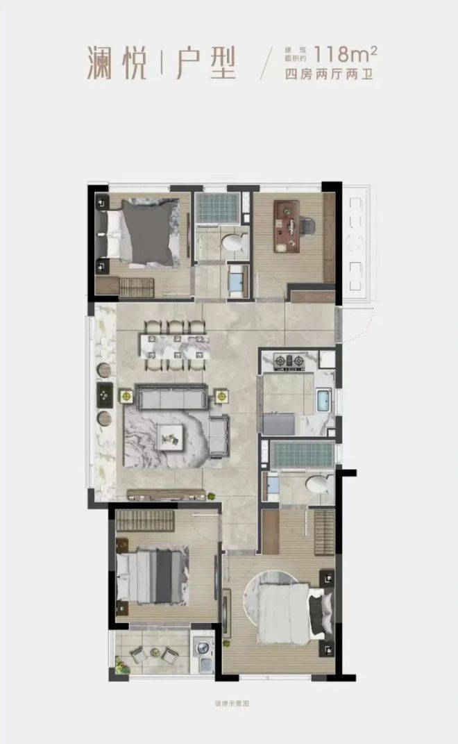 118㎡|澜悦|四房两厅两卫:约118平户型最为惊艳,全部边套设计。如今市面上的四房如果要追求尺度,基本要130平以上;小面积四房,基本是3+1房设计,数字1大多代表的是像储藏间或衣帽间这样的功能房。但湖沁宸园的118平,是完整四房格局,兼具尺度与功能性。