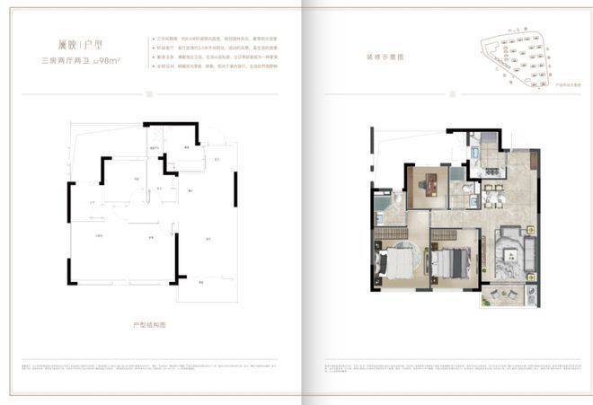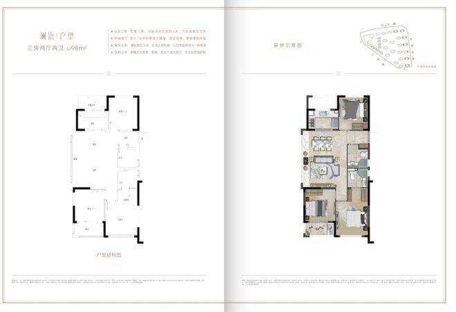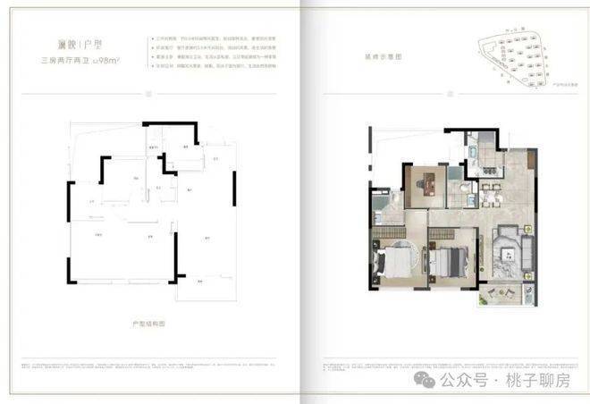 主力户型:98㎡三房两卫、118㎡四房两卫,得房率78%-80%。