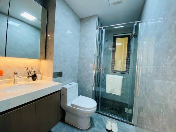 入户同样是一个大边厅,面宽约6米。两个卫生间内的淋浴房也都是标准的“一字型”,相当宽敞。交付装标清单中除了中央空调与新风系统两大标配,118平还带有净水器。如果首付能凑一凑,能一步到位的四房肯定是刚需最佳选择。