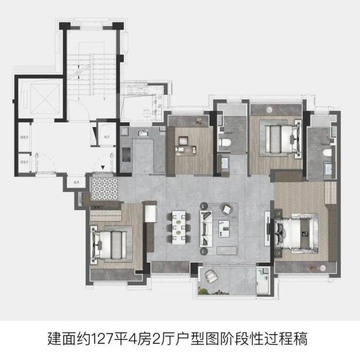 建面约127㎡直接进阶4房,功能性拉满,适配当下越来越多的二胎或三代同堂家庭。