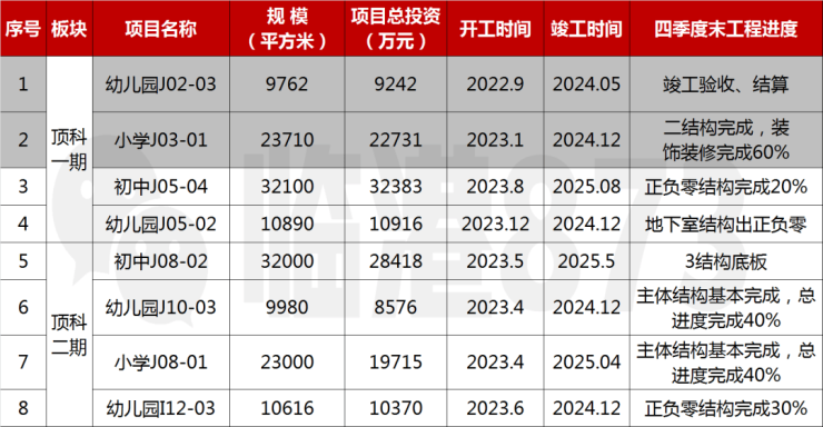 顶科社区公建配套学校建设计划:上实•听海毗邻的J10-3地块幼儿园计划24年12月竣工,J08-01小学和J08-02初中分别计划在25年4月和5月先后竣工。