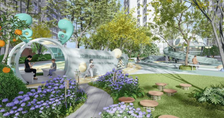 以江南人文精神为源点,打造两轴一环五进空间,江南礼序归家轴串联启迎盛礼、筑阙会友、归家华堂等5重礼制。尊崇归家;健康运动轴以24小时跑道为社区活力生活环,串联儿童乐园、长者康养、疗愈花园等10大生活场景,营造全龄全时的江南诗意生活。