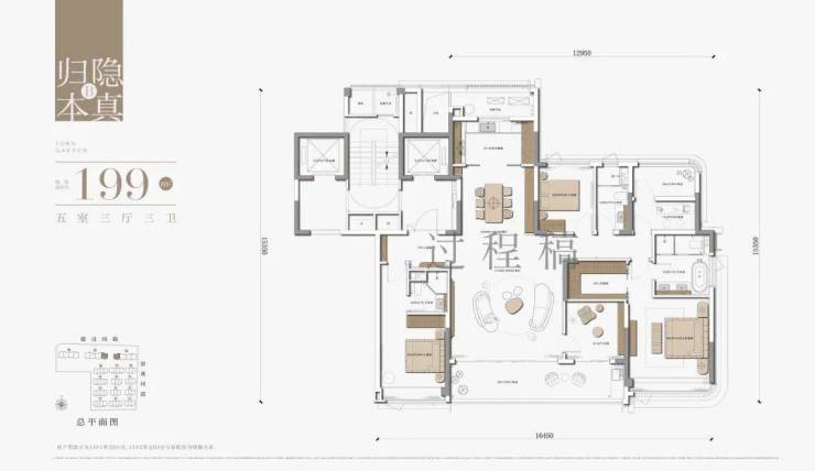 规划5栋17层高层(190套)与6栋4层滨水联排(42套),高层面积段169-199㎡,联排300-340㎡。