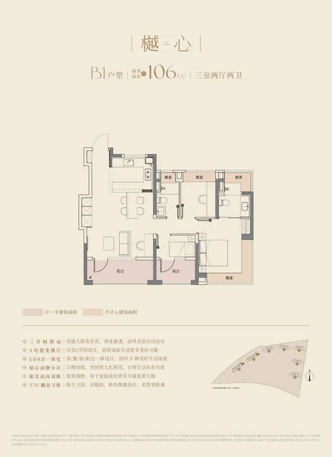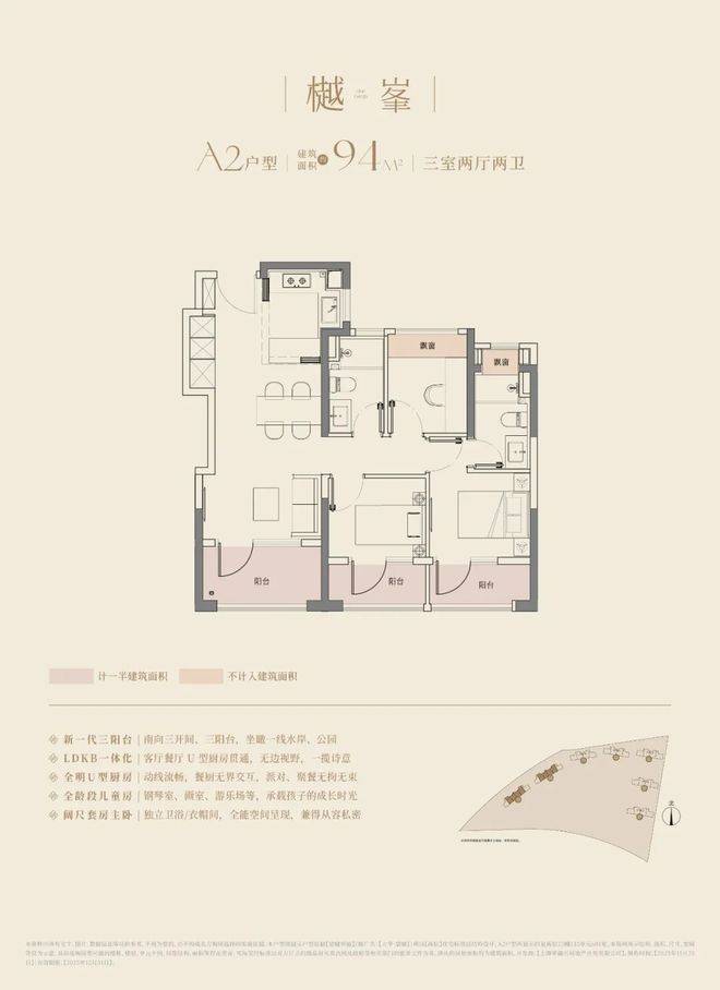 约94㎡起步户型:设计了市场上不多见的南向三阳台,凭借充足(约9%)的赠送面积,实现空间利用率最大化。
