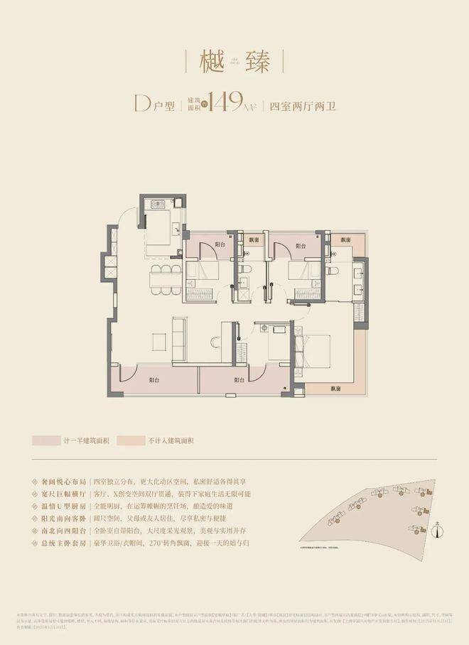 经典动静分离户型,4.5开间朝南+南北四阳台,阳合仅计算一半建筑面积,主卧以及主卫附赠270°转角飘窗;