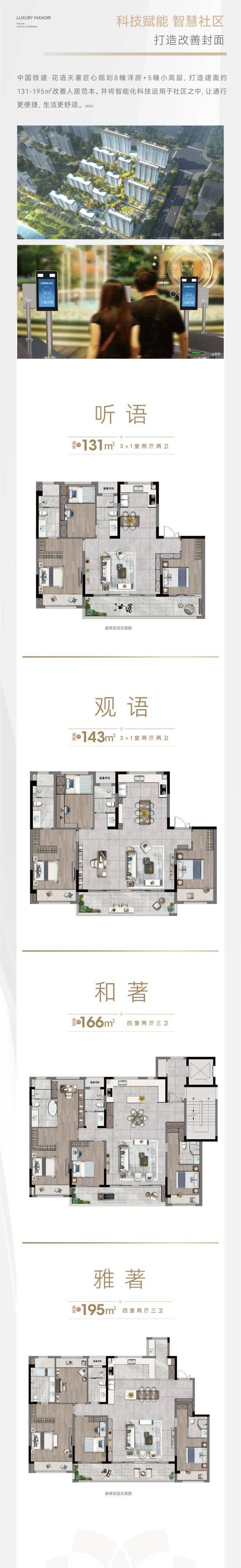 突破常规空间界限,中国铁建·花语天著洋房产品以建面约166㎡、195㎡的户型面积,以恰到好处的空间设计与奢阔布局,确定其纯正的改善定位。