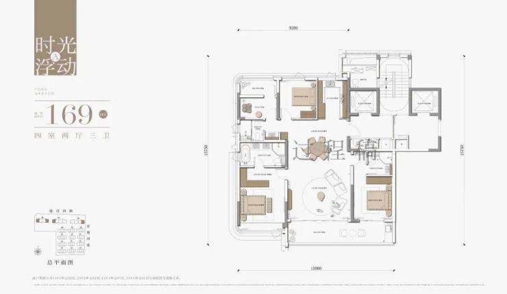 规划5栋17层高层(190套)与6栋4层滨水联排(42套),高层面积段169-199㎡,联排300-340㎡。