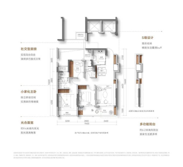 户型方正,没什么浪费面积,虽然是中间套设计,但做到了全明户型,通风效果好;南向三开间,双联阳台+飘窗,南向采光充足,阳光满堂;超配S墙,隐藏收纳柜,让小家越住越大,可以说杭州少见。