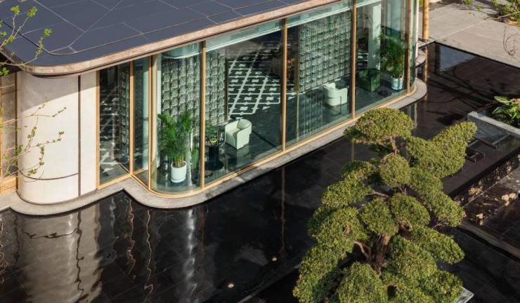 立面方面,汲取现代轻奢法式的白金美学灵感,叠加大面玻璃,打造出光影灵动的对称式金色画框立面。